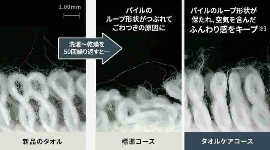 ES-12X1には、タオルケアコースが新たに搭載されました。このコースは、全工程でタオルを優しく処理し、特に乾燥時には約50℃の低温風でパイルを潰さずにふんわりと仕上げます。